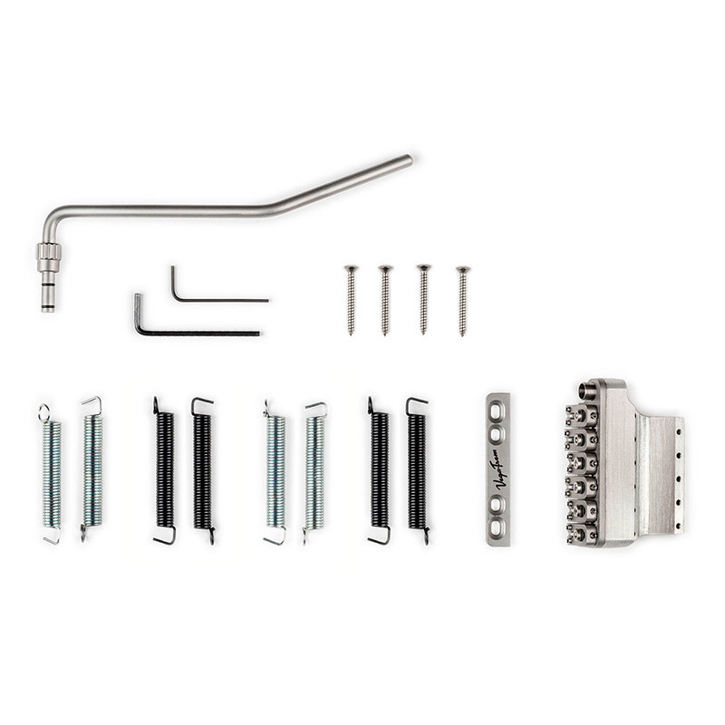 This vintage tremolo has remained virtually unchanged since the creation of the Stratocaster®. Fender® stamped saddles and six mounting screws define the vintage tone of this tremolo assembly. Includes six saddle bridge assembly, tremolo claw, tremolo tension springs, tremolo arm, tremolo arm tip, tremolo arm tension spring, string tree, .050 hex...