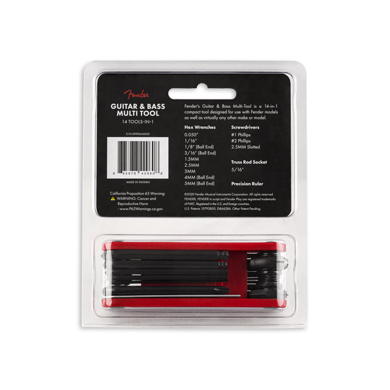 Fender's Guitar & Bass Multi-Tool is a 14-in-1 compact tool designed for use with Fender models as well as virtually any other make or model. Its one-piece body allows for ease of use and rotation while the included truss rod size hex wrenches are ball end for easy access. Featuring standard and metric sizing, this multi-tool serves as a toolbox in your pocket, providing maximum functionality for all of your instrument repair and tech work needs.