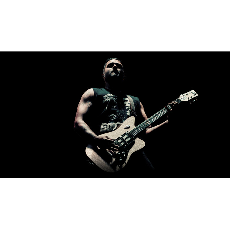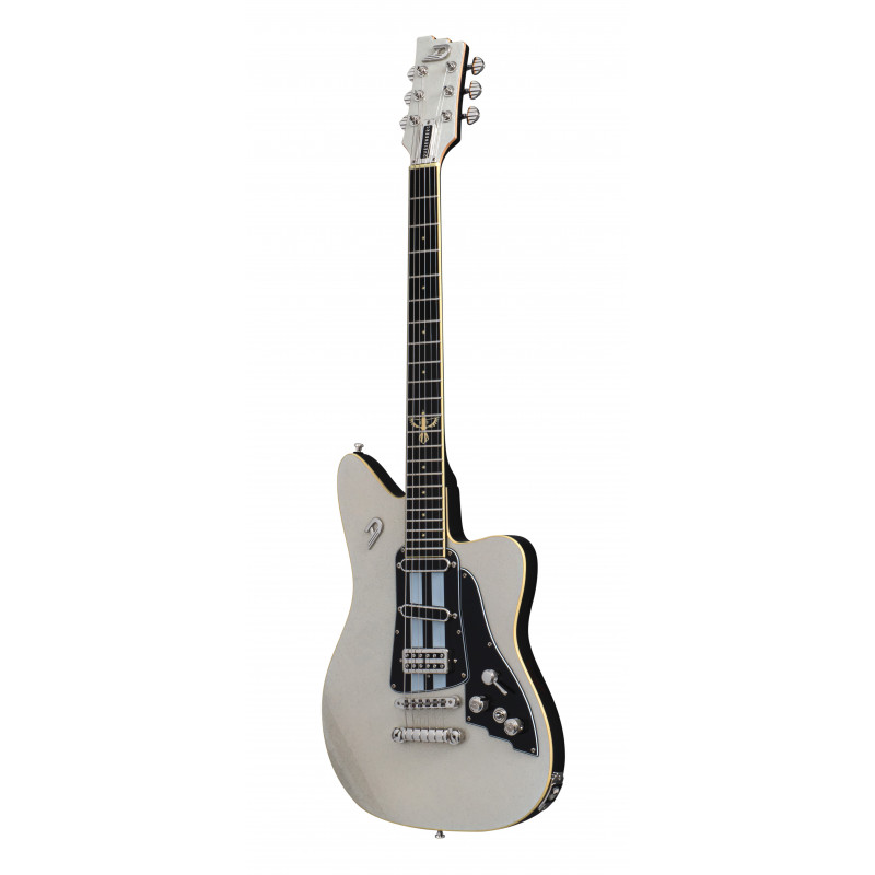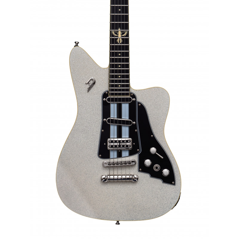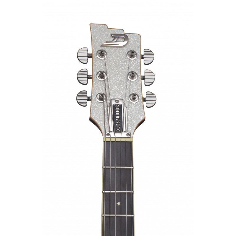 DUESENBERG ALLIANCE SERIES DAVE BAKSH - SUM41 Type: Set Neck, 1-piece Maple Width: 42.5 mm / 1.67" (nut), 52 mm / 2.05" (12th fret) Thickness: 21 mm / 0.8" (1st fret), 24 mm / 0.95" (12th fret) Shape: Medium D Fingerboard: Indian Rosewood, radius 305 mm / 12" Inlays: Sum41 Stars "Magpie" at 12th fret Frets: 22 Jumbo 2.8 x 1.0 mm Scale length: 648 mm / 25.5" Trussrod: Steel dual-action Headstock: White-Sparkle Body Type: Solid-Body, Alder Dimensions: 46 x 34 cm / 18" x 13.4" Height (sides): 4.2 cm / 1.7" Binding: Cream Pickguards: Black with custom white stripes Finish: PUR lacquer Hardware Tuners: Duesenberg Z-Tuners Bridge: Duesenberg 3-Point Radius Bridge Tailpiece: Duesenberg Wrapper Strap pins: Duesenberg Standard (Straplock compatible) Hardware color: Nickel Strings: Duesenberg Custom 10/50 (010-013-017-028-042-050) Electrics Pickup (neck): Duesenberg Alnico Blade Pickup (middle): Duesenberg Pearlito Pickup (bridge): Duesenberg LittleToaster Wiring: 1 Volume, 1 Tone, 4-Way Pickup Selector, Kill-Switch Accessories Case: Custom Line Case (included) Tools: All required allen keys (included)