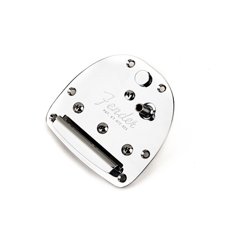 Made for Fender® instruments in a variety of vintage-style and contemporary models. Nickel-plated steel tremolo plate with stop tailpiece. "Fender" and "Pat # 2972923" are stamped into the plate. Assembly also includes tremolo lock button and tremolo arm bushing. Assembly does not include tremolo arm or tremolo-to-bridge mounting screws. Fits imported '62 Jaguar®/Jazzmaster® models (Japan) manufactured from '86-'99.