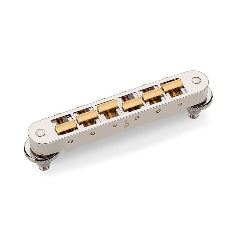 GOTOH® GE103B-T TUNE-O-MATIC BRIDGE 6mm METRIC POSTS NICKEL -Strings Spacing : 52mm (10.4 x 5) -Saddle Material : Hard Zinc -Posts Spacing : 74mm -Posts Thread : M8 -Radius : R300
