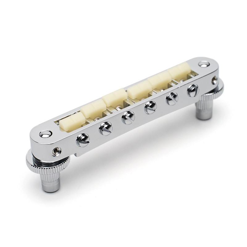 GOTOH® GE103B-T TUNE-O-MATIC BRIDGE 6mm METRIC POSTS NICKEL -Strings Spacing : 52mm (10.4 x 5) -Saddle Material : Hard Zinc -Posts Spacing : 74mm -Posts Thread : M8 -Radius : R300