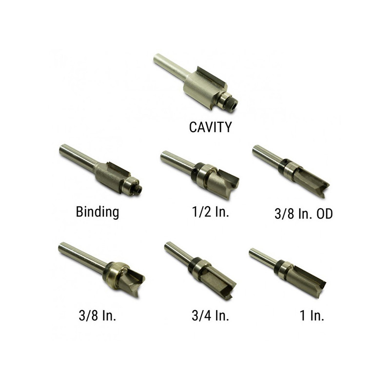These high quality carbide bits are designed for luthier applications. Available for binding, template cuts, and control cavities. After cutting a control cavity in the back of a guitar, this bit will cut a perfect symmetrical ledge to mount your backplate on. Bit shaft diameter = 1/4 in.