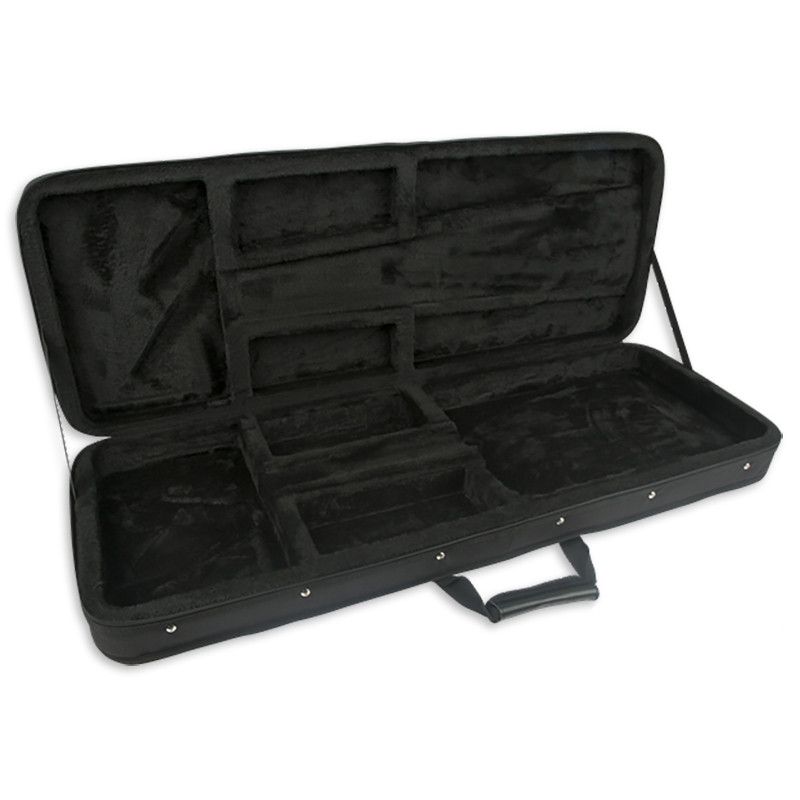 Caractéristiques black vinyl wrapped 3-ply hardshell wood case 8mm sides and 5mm top and bottom Brown or black vinyl wrapped steel core carry handle Soft crushed acrylic plush interior lining Large accessory storage compartment with lid Steel draw latches; 1 locking latch with key set Triple chrome plated hardware