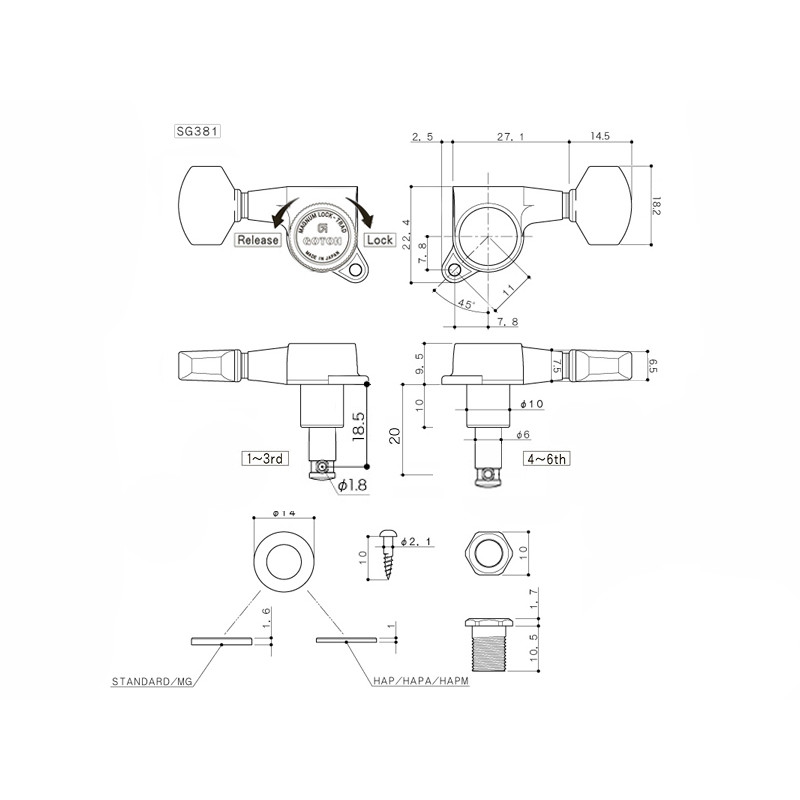 GOTOH® SG381 MG-T LOCKING MACHINE HEADS FOR LEFT HAND 6x1 RATIO 1:16 CHROME -Gear Ratio : 1:16 -Drill hole : 10mm
