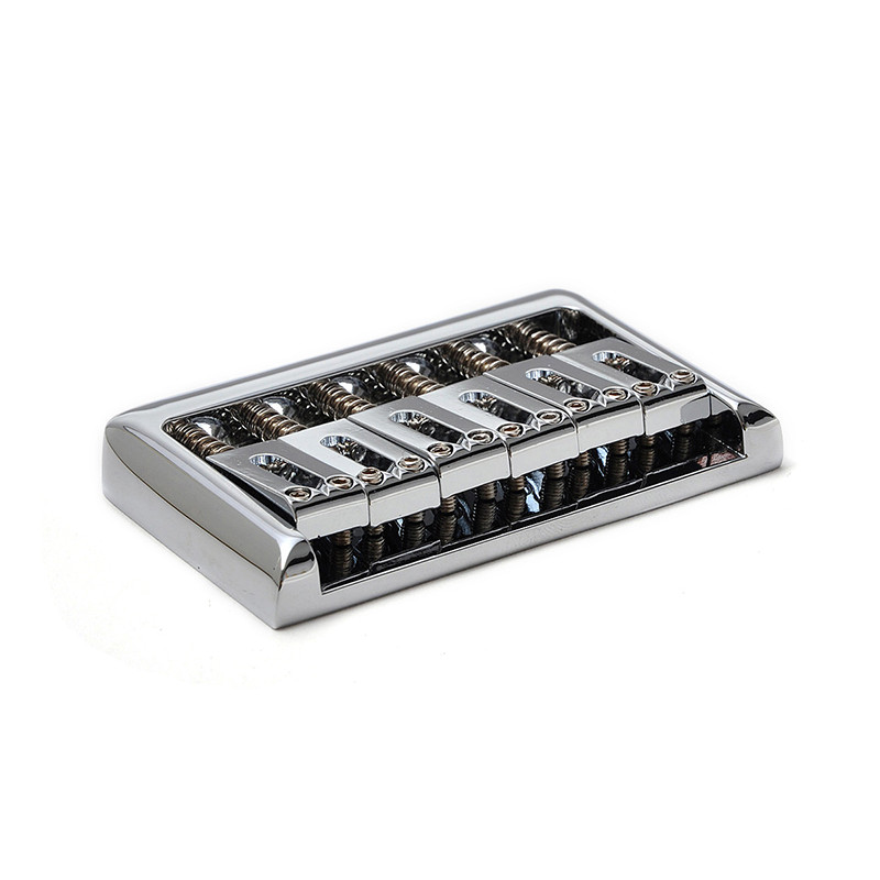The Hipshot Fixed Bridge is the ultimate marriage of performance, beauty and ergonomics. Each bridge is hand polished for a smooth, comfortable feel under your palm. The stainless steel saddles have a crisp string relief edge, eliminating dull tones. The side walls lock your saddles in place no matter how hard you thrash. - Machined, solid brass base...