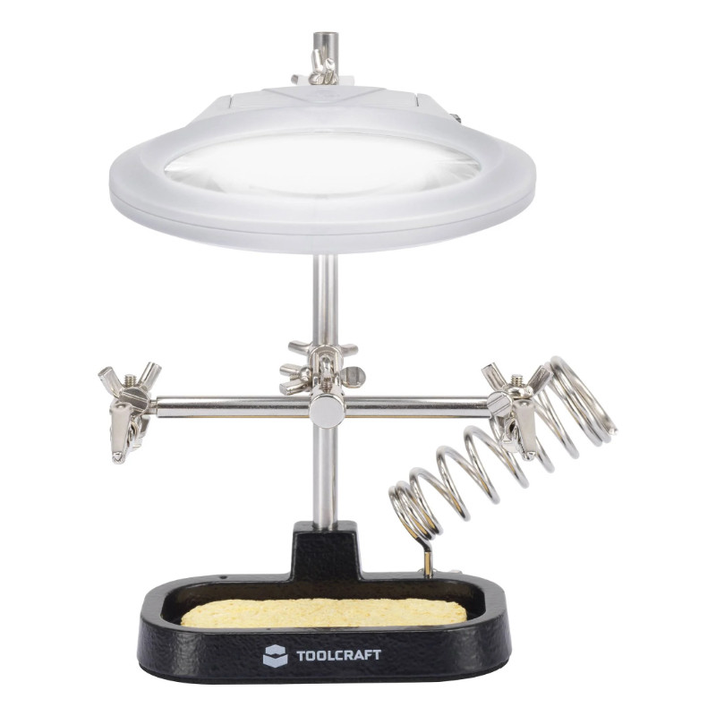 ·Two alligator clips and a magnifying glass with LED lighting make it easy to work with small parts.