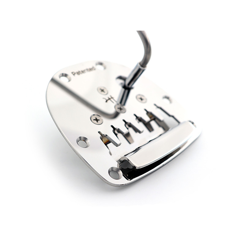 DG tremolo system in an ultra-small design and all the advantages of the göldo DG series: butter-smooth operation in "up & down" modes and an elegantly shaped round tremolo arm with safe, settable zero point, adjustable in all dimensions. A true alternative! Including the screws for mounting the base plate. With round tremolo arm. Required routing...