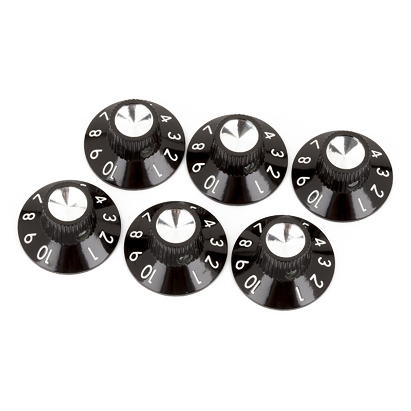 ·Set of six black-skirted 1-10 replacement amplifier control knobs with white stamping and silver center disc