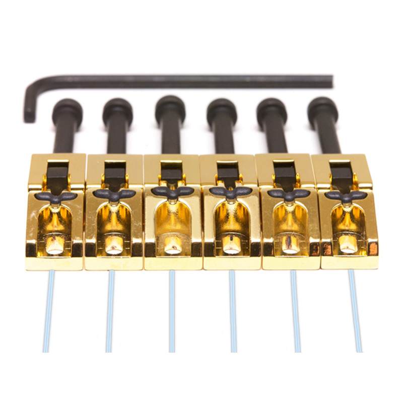 The PG0080-G6 is a set of six String Saver Classics for original Floyd Rose style bridges in an all gold finish. They have a small String Saver insert in the saddle to dramatically reduce string breakage and improve tuning stability. They are a drop in replacement for any Floyd Rose style original bridge.