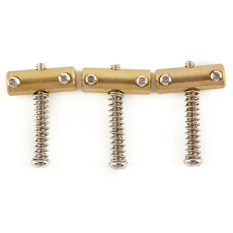 Made from the highest-quality material, Fender® bridge sections come with springs and screws (except where noted). Set of three vintage-style brass Telecaster® compensated bridge saddles. Package includes saddles, intonation springs and slotted intonation screws, and saddle height adjustment screws. Fits 3-saddle vintage-style bridge plate designs. Saddles will not fit a standard six saddle bridge plate.