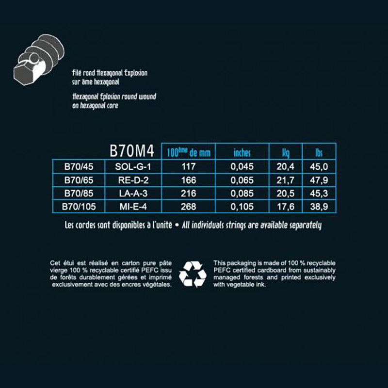 Les cordes pour guitare basse Hexagonal Explosion sont filées métal et plaquées nickel sur une âme hexagonale. Elles optimisent au maximum les qualités spécifiques du son et du feeling de l’âme hexagonale : réponse précise, projection rapide et puissance du son. La recherche particulière faite sur la flexibilité et l’élasticité rend le jeu facile et...