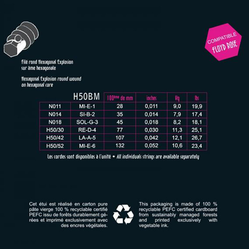 Les cordes pour guitare basse Hexagonal Explosion sont filées métal et plaquées nickel sur une âme hexagonale. Elles optimisent au maximum les qualités spécifiques du son et du feeling de l’âme hexagonale : réponse précise, projection rapide et puissance du son. La recherche particulière faite sur la flexibilité et l’élasticité rend le jeu facile et...