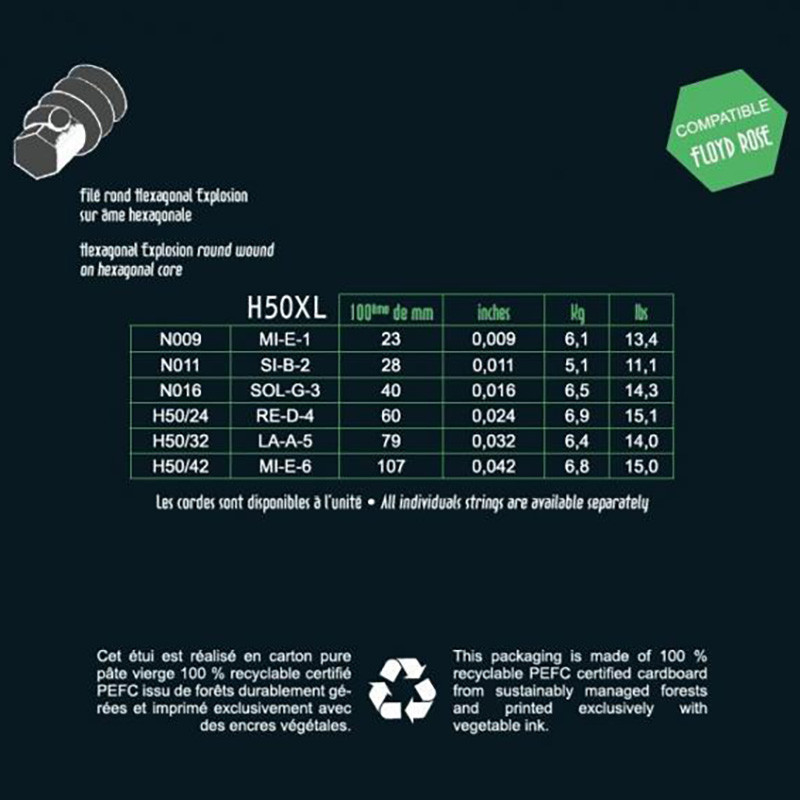 Les cordes pour guitare basse Hexagonal Explosion sont filées métal et plaquées nickel sur une âme hexagonale. Elles optimisent au maximum les qualités spécifiques du son et du feeling de l’âme hexagonale : réponse précise, projection rapide et puissance du son. La recherche particulière faite sur la flexibilité et l’élasticité rend le jeu facile et...