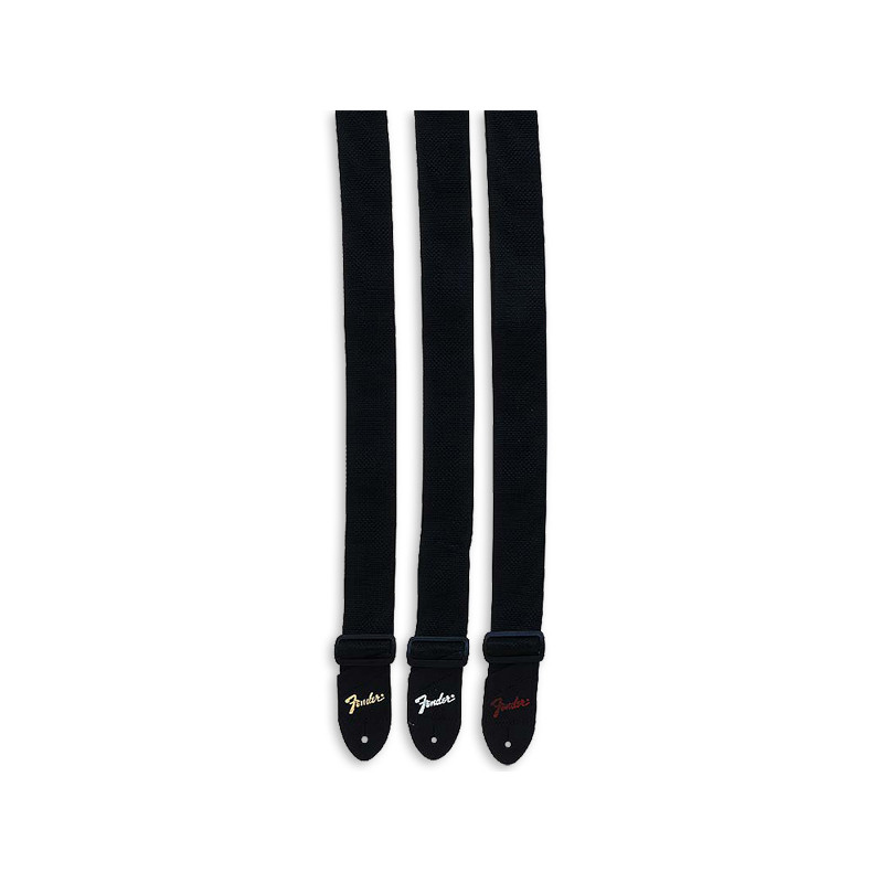 FENDER® RUNNING LOGO STRAP There's no better way to simultaneously maintain optimal comfort and timeless Fender style than this durable woven 2" wide guitar strap. Fully adjustable length (30”-51”) provides a versatile fit for most players. Reinforced leather ends and polyester backing provide durability and stability during every performance. Contrasting...