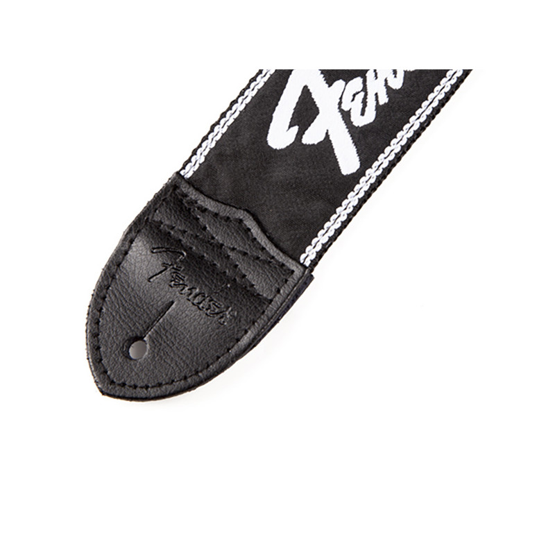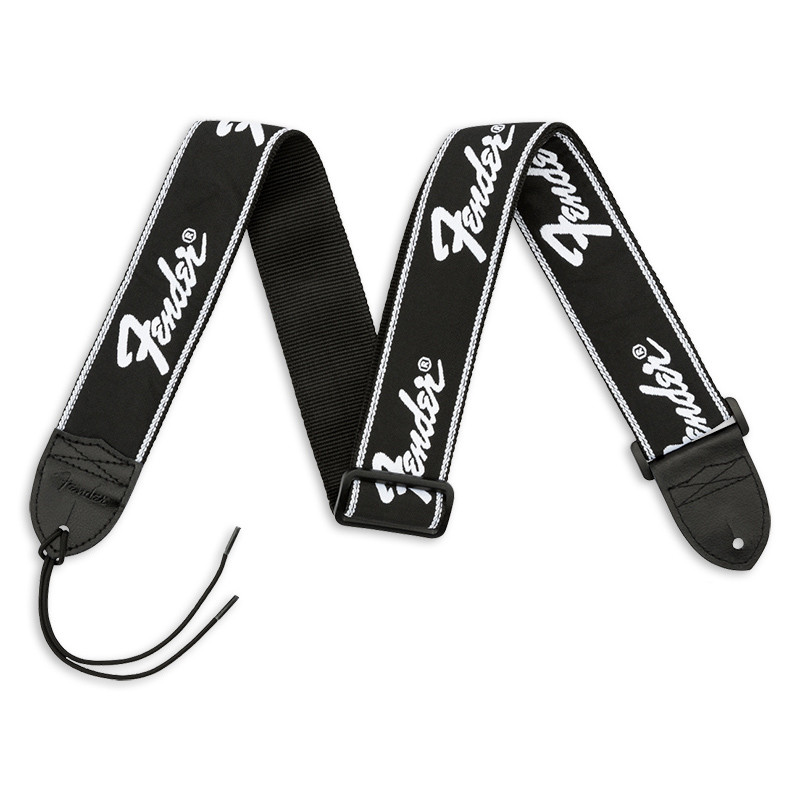 FENDER® RUNNING LOGO STRAP There's no better way to simultaneously maintain optimal comfort and timeless Fender style than this durable woven 2" wide guitar strap. Fully adjustable length (30”-51”) provides a versatile fit for most players. Reinforced leather ends and polyester backing provide durability and stability during every performance. Contrasting white stitching and Fender logos deliver an all-around traditional look.