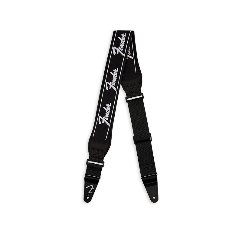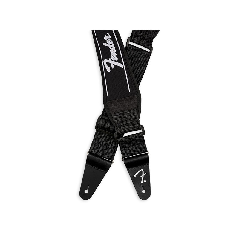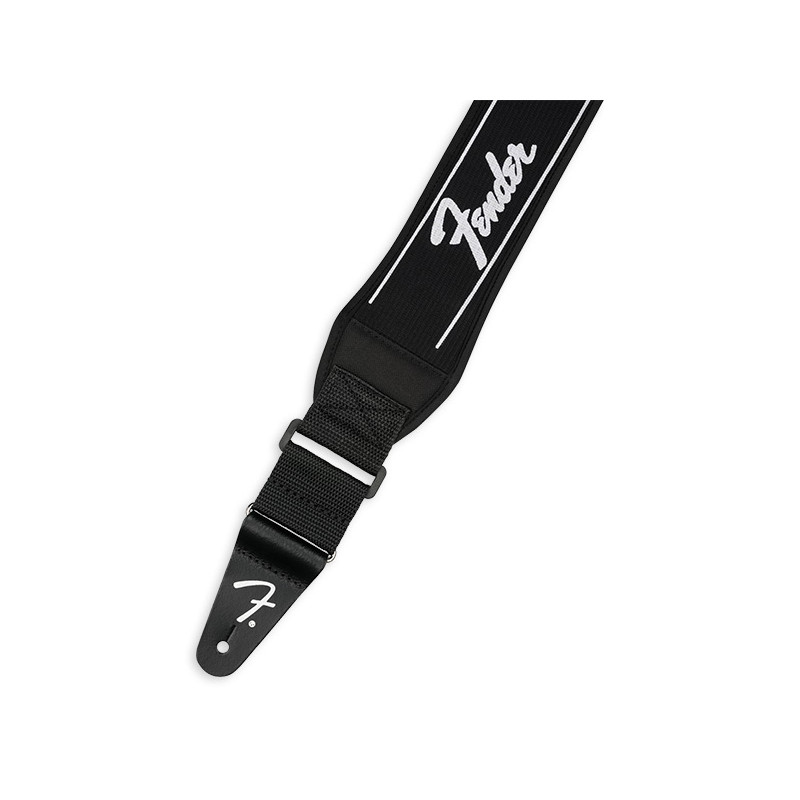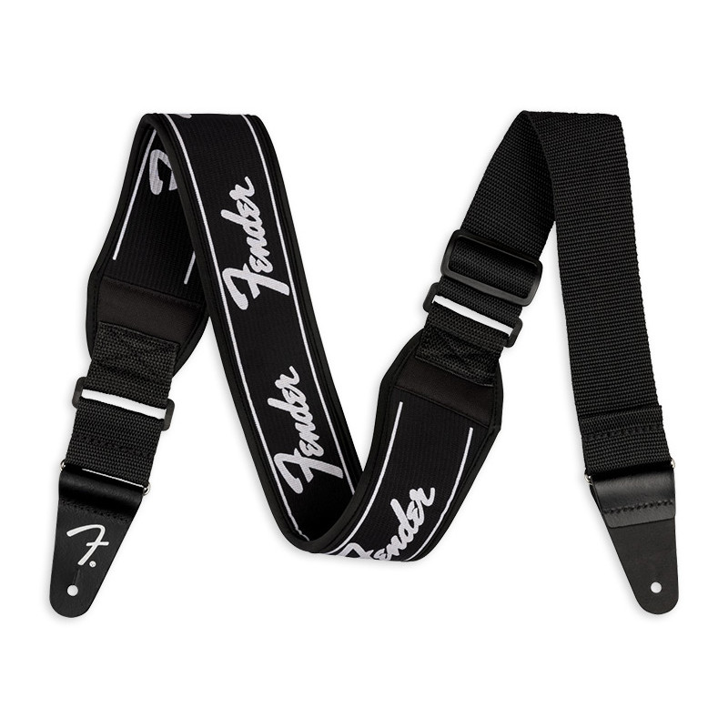 FENDER® RUNNING LOGO STRAP There's no better way to simultaneously maintain optimal comfort and timeless Fender style than this durable woven 2" wide guitar strap. Fully adjustable length (30”-51”) provides a versatile fit for most players. Reinforced leather ends and polyester backing provide durability and stability during every performance. Contrasting...