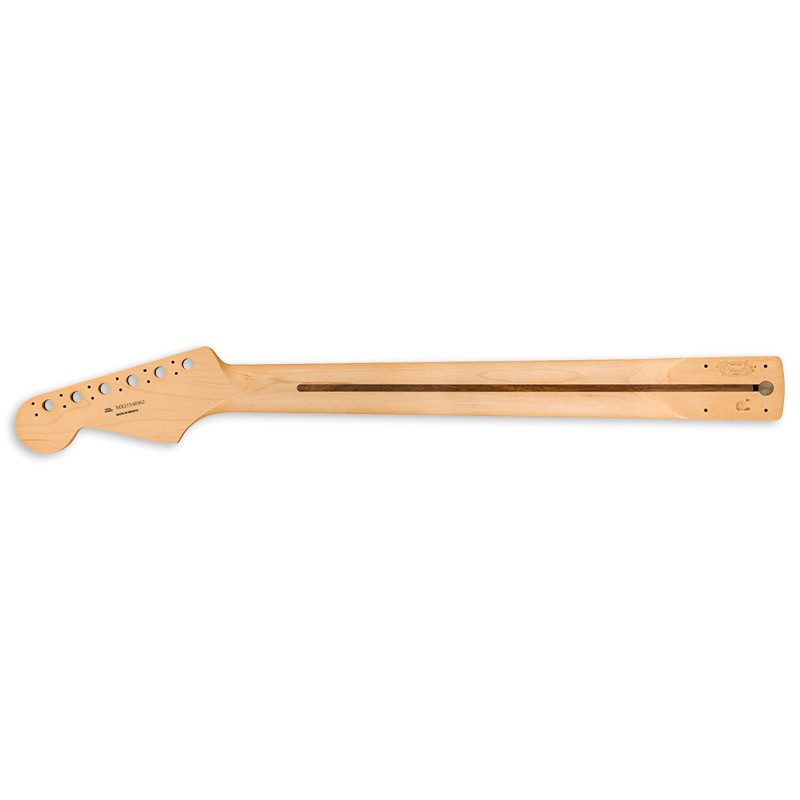 Crafted at our Ensenada, Mexico manufacturing facility, this genuine vintage-style Fender Stratocaster® guitar neck features a comfortable "Soft V" profile and 9.5"-radius maple fingerboard with 21 medium jumbo frets. The synthetic bone nut is pre-slotted with "pilot" string location grooves to make spacing a breeze when performing the final string slot...