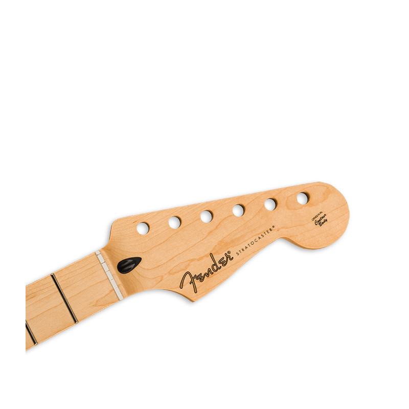 Crafted at our Ensenada, Mexico, manufacturing facility, this genuine Fender Player Series Stratocaster® guitar neck features a comfortable "modern C" profile and 9.5"-radius maple or pau ferro fingerboard with 22 medium jumbo frets. The nut is pre-slotted with "pilot" string location grooves to make spacing a breeze when performing the final string slot filing, and a satin finish on the back offers smooth playability. For true Fender authenticity, it's also serialized and stamped, with genuine "Original Contour Body" headstock decal. This replacement neck is for a Fender or Squier® by Fender guitar. Because Fender genuine replacement necks have not been mounted to guitar bodies, nut slots must be cut by qualified personnel. Other installation processes may be required, such as fret work, fitting the neck to the neck pocket, and other instrument setup procedures. Your local FMIC Authorized Service Center can install genuine replacement necks; find Authorized Service Center locations near you in the “Support” section of fender.com.