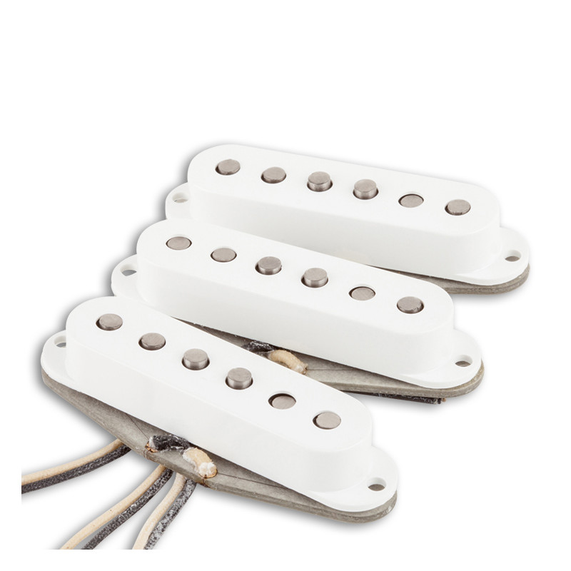 As Heard on Various Fender Custom Shop Stratocaster® guitars Fender Custom Shop Custom ’69 Strat single-coil pickups produce the full, punchy tone that defined rock in the late ’60s. Especially effective with pedals. Tonal Characteristics Enamel-coated magnet wire delivers warm vintage-style tones Staggered polepieces balance volume and output across every string Alnico 5 magnets add more focus and enhanced dynamics Product Detail Period-correct cloth wire and gray fiber bobbin construction Available with white pickup covers Included Components Fender Custom Shop Custom ’69 Strat pickups come with all parts needed for installation, including: Mounting screws Pickup height adjustment tubing Wiring diagram Output Rating (Bass/Mid/Treble) 5/4/5 Other Specifications DC Resistance: 5.8k ohms Inductance: 2.2 henries Dimensions 1.50x4.75x5.00 IN Poids 0.60 LB