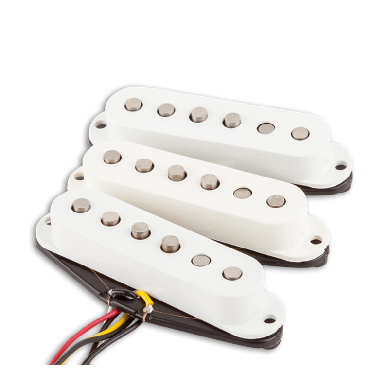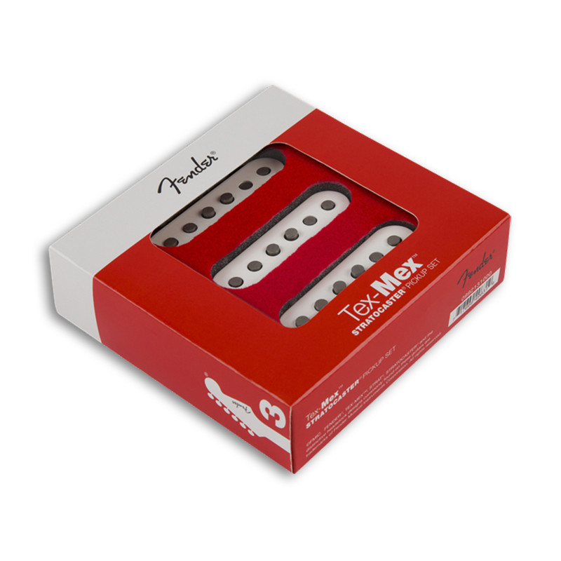 As Heard on Fender® Jimmie Vaughan Tex-Mex™ Stratocaster® guitar Fender Tex-Mex Strat single-coil pickups offer increased output, sparkling highs and attention-grabbing warm tone that keeps all the characteristics of your favorite vintage-style Stratocaster. From Texas grit to soaring clean tone, they’re the pickups of choice for versatile players. Tonal Characteristics Staggered polepieces balance volume and output across every string Reverse-wound/reverse-polarity middle pickup cancels hum in pickup-switch positions two and four Alnico 5 magnets add more focus and enhanced dynamics Over-wound bridge pickup produces tight, clear bass and maximum output Product Details Polysol-coated magnet wire Vinyl-coated output wire and durable plastic bobbin construction Available with white pickup covers Included Components Fender Tex-Mex Strat pickups come with all parts needed for installation, including: Mounting screws Pickup height adjustment tubing Wiring diagram Output Rating (Bass/Mid/Treble) Neck: 4/5/5 Middle: 4/5/5 Bridge: 7/5/5 Other Specifications DC Resistance Neck: 6.4k ohms Middle: 6.4k ohms Bridge: 7.4k ohms Dimensions 1.70x4.75x5.10 IN Poids 0.70 LB