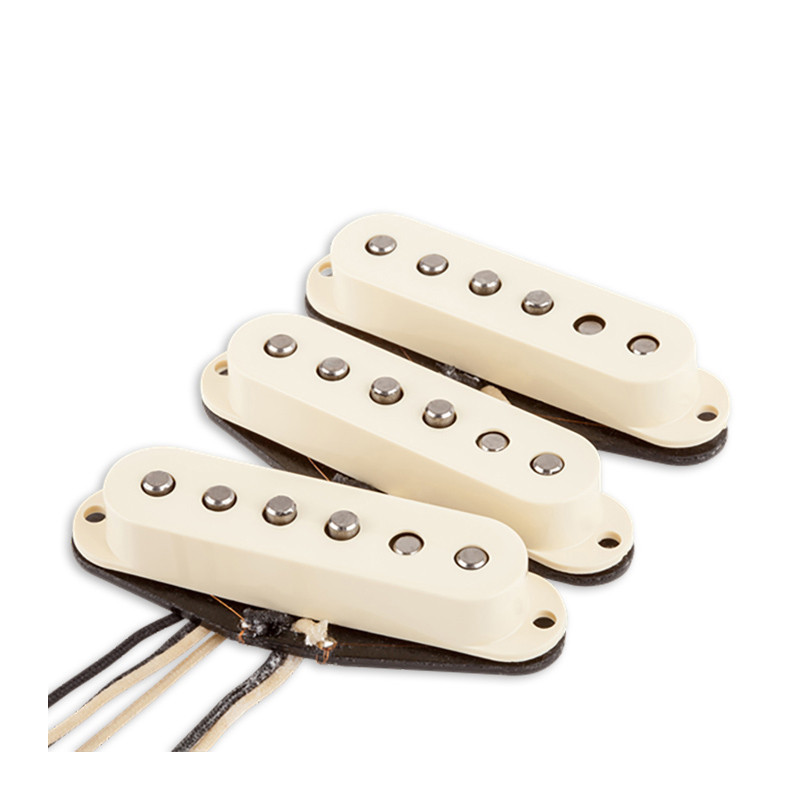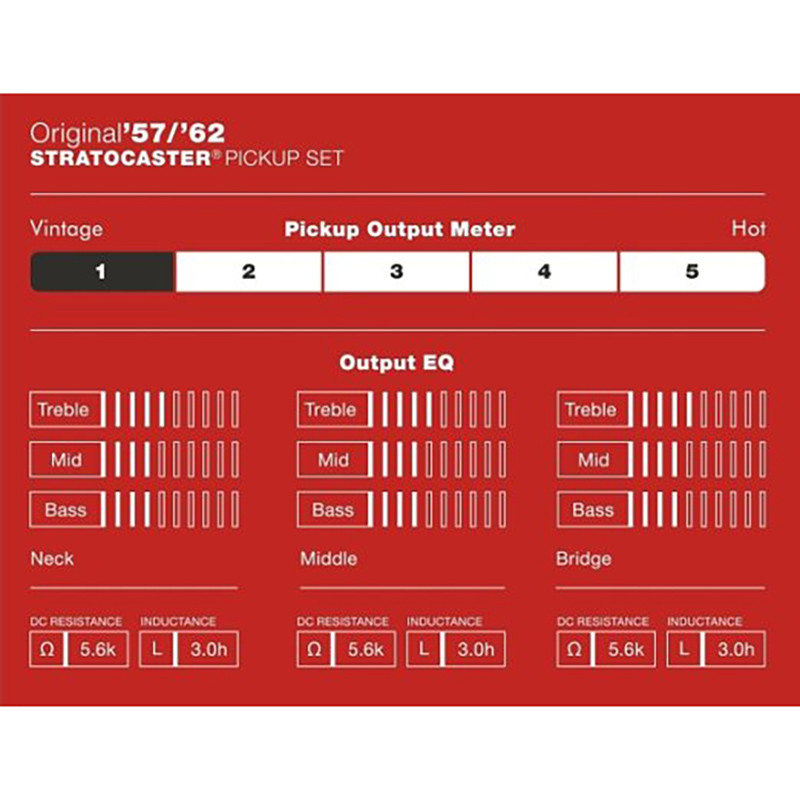 As Heard on Fender® American Vintage Stratocaster® guitar Fender Original ’57/’62 Strat® single-coil pickups are reverse-engineered from a 1963 Stratocaster guitar. These pickups deliver vintage-Strat sound, feel and vibe, with glistening highs and warm lows. Tonal Characteristics Formvar magnet wire adds brightness and glassiness Staggered hand-beveled polepieces balance volume and output across every string Alnico 5 magnets add more focus and enhanced dynamics Product Details Cloth wiring and fiber bobbin construction Available with aged white pickup covers Included Components Fender Original ’57/’62 Strat pickups come with all parts needed for installation, including: Mounting screws Pickup height adjustment tubing Wiring diagram Output Rating (Bass/Mid/Treble) Neck: 5/4/6 Middle: 5/4/6 Bridge: 5/4/6 Other Specifications DC Resistance Neck: 5.6k ohms Middle: 5.6k ohms Bridge: 5.6k ohms Neck: 3.3 henries Bridge: 3.95 henries Dimensions 1.50x4.75x5.00 IN Poids 0.50 LB