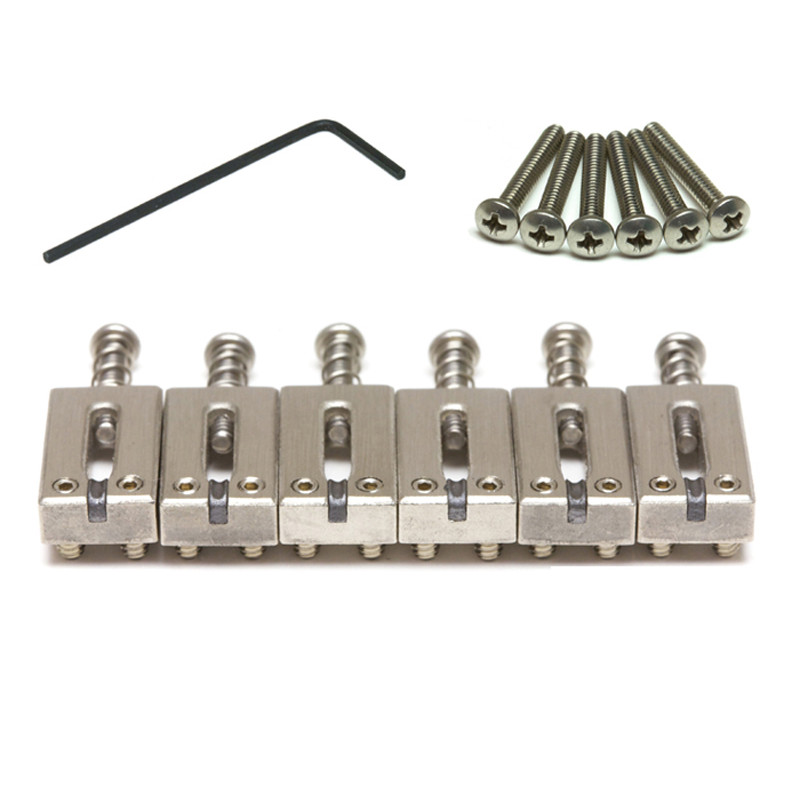 The PS-8001-00 is a perfect upgrade or replacement set of saddles for your Strat or Tele style guitar. They have an off set intonation screw and a 2 1/16th string spacing. Included with the set is a set of slightly longer intonation screws to be used for a Telecaster.