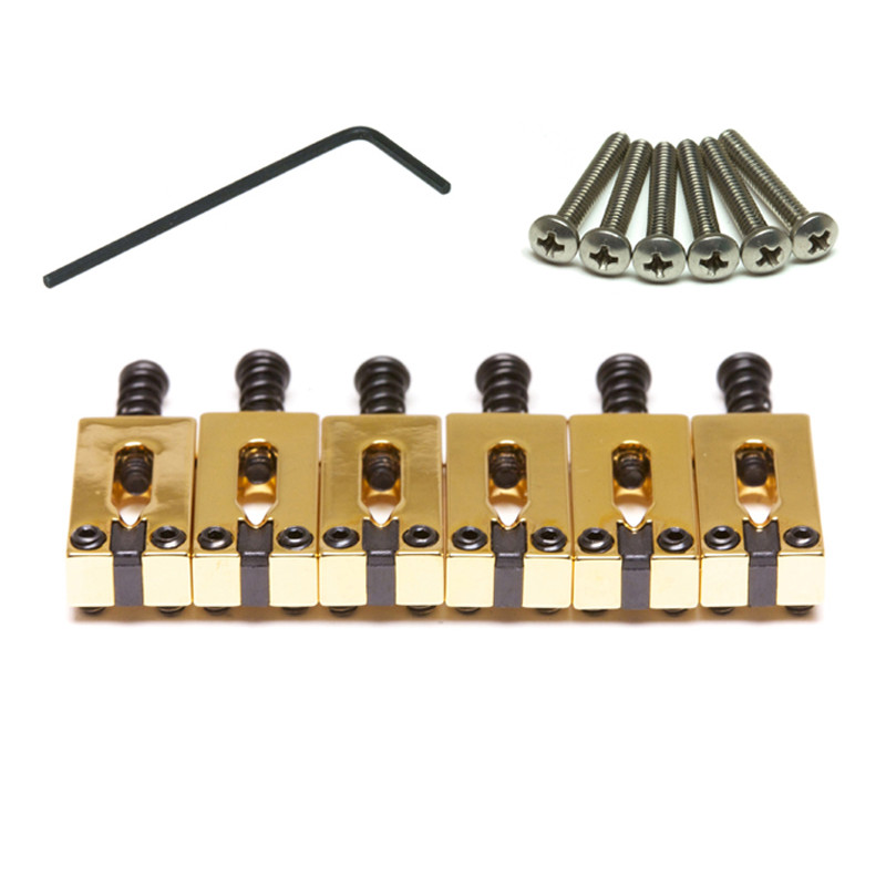 The PG8000-FG is a set of six String Saver Classics for Strat or Tele style guitars with a 2 3/16th string spacing in gold. They have a small String Saver insert in the saddle to dramatically reduce string breakage and improve tuning stability. The set comes with a set of slightly longer intonation screws to be used with a Telecaster.