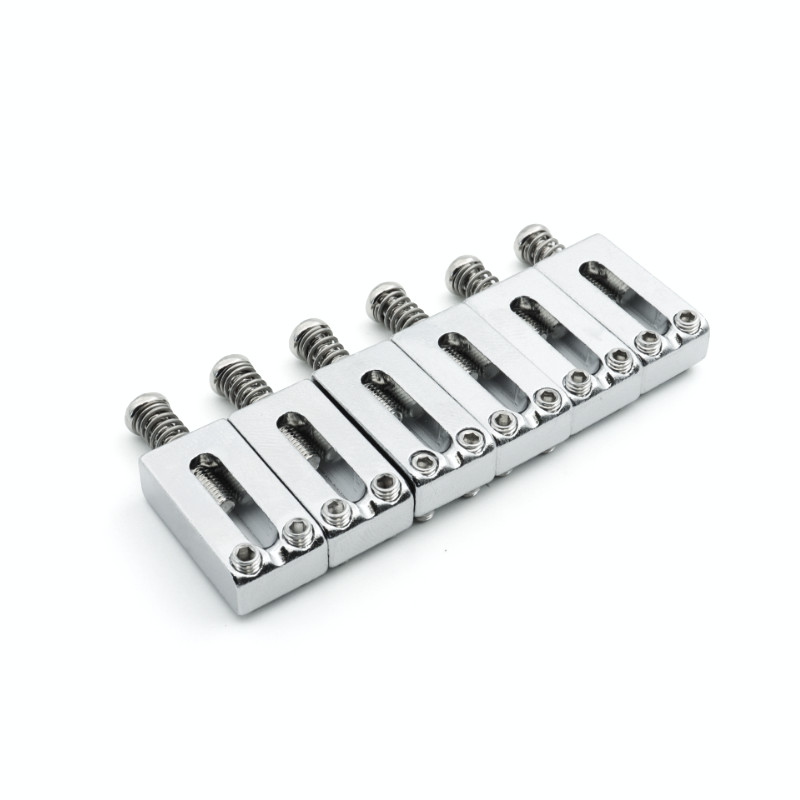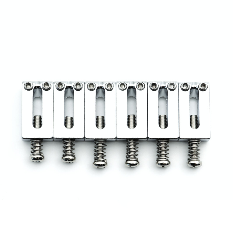 Lot de six pontets de chevalet plaqués nickel/chrome pour les modèles Stratocaster de série American Vintage produits à partir de 1986. Vis d'intonation centrées, ressorts d'intonation et vis pour régler la hauteur de pontets inclus.