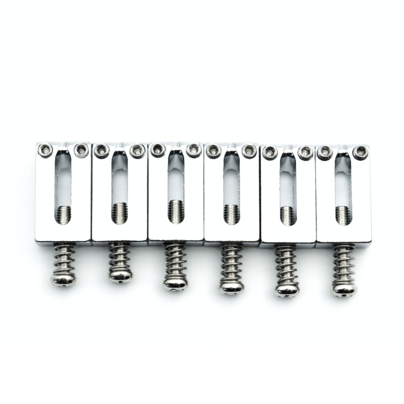 Lot de six pontets de chevalet plaqués nickel/chrome pour les modèles Stratocaster de série American Vintage produits à partir de 1986. Vis d'intonation centrées, ressorts d'intonation et vis pour régler la hauteur de pontets inclus.
