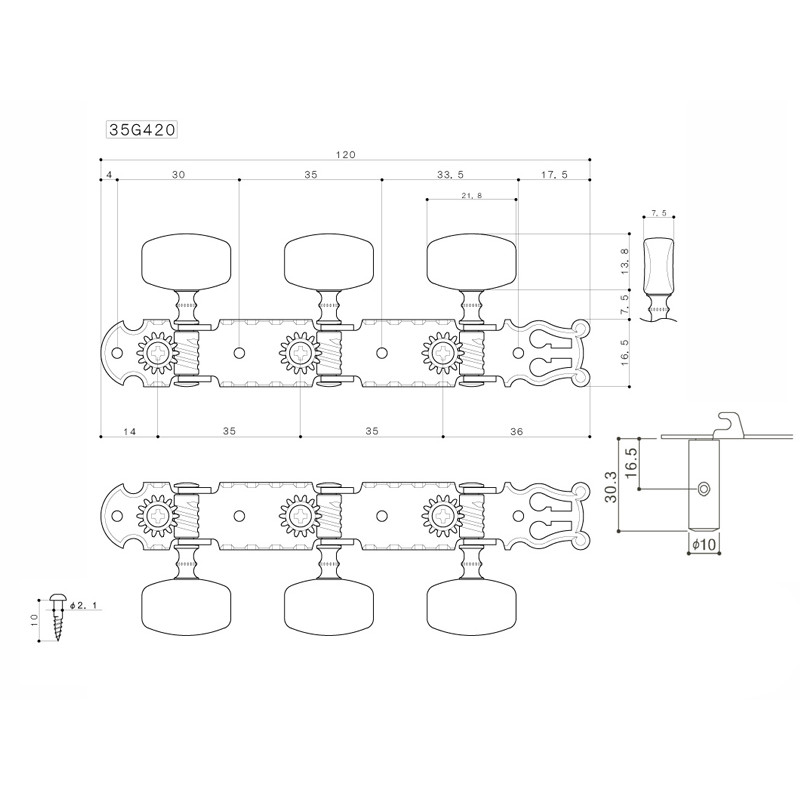 GOTOH® 35G510 SERIES MACHINE HEADS FOR CLASSICAL GUITAR IVORY BUTTONS ALUMINIUM ROLLER POSTS (1:16) X-NICKEL -Set : 2pcs -String Post : 35AR -Gear Ratio : 1 : 16 -Weight : 78.7 g/1pc (One side) -Plate Material : Brass
