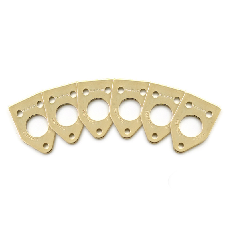 The PRT-952-216 is a set of 6 Ratio InvisoMatch Standard Installation Plates, designed for easy installation of Ratio Tuned Machine Heads. Match the correct plates to the current machine head screw position on your guitar. Use your guitars existing mounting screw holes for a fast, perfect Ratio Installation. It has a 90 degree screw hole mount.