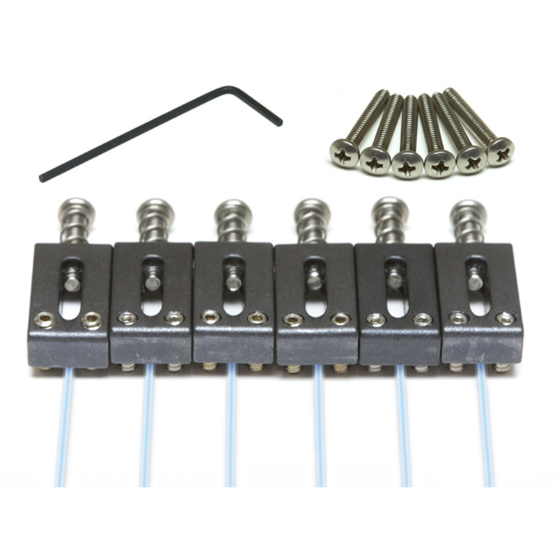 The PN-8001-00 is a set of six ghost loaded saddles with a offset intonation screw. They are designed to work with any of our ghost preamp kits. They will fit any Stratocaster or Telecaster style guitar with a string spacing of 2 1/16th. Each set of saddles come with a set of longer intonation screws for use with modern style Telecaster style guitars.
