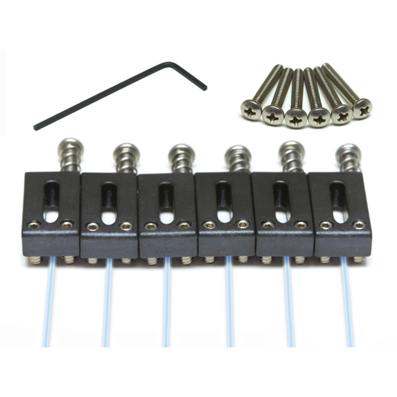 The PN-8000-00 is a set of six ghost loaded saddles with a centered intonation screw. They are designed to work with any of our ghost preamp kits. They will fit any Stratocaster or Telecaster style guitar with a string spacing of 2 1/16th. Each set of saddles come with a set of longer intonation screws for use with modern style Telecaster style guitars.