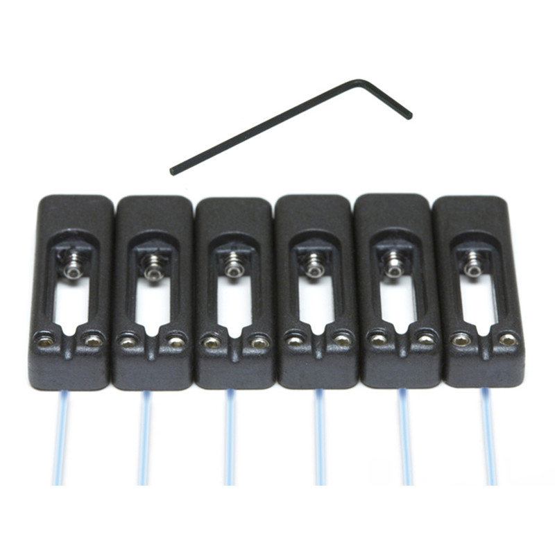 The PN-8001-00 is a set of six ghost loaded saddles with a offset intonation screw. They are designed to work with any of our ghost preamp kits. They will fit any Stratocaster or Telecaster style guitar with a string spacing of 2 1/16th. Each set of saddles come with a set of longer intonation screws for use with modern style Telecaster style guitars.